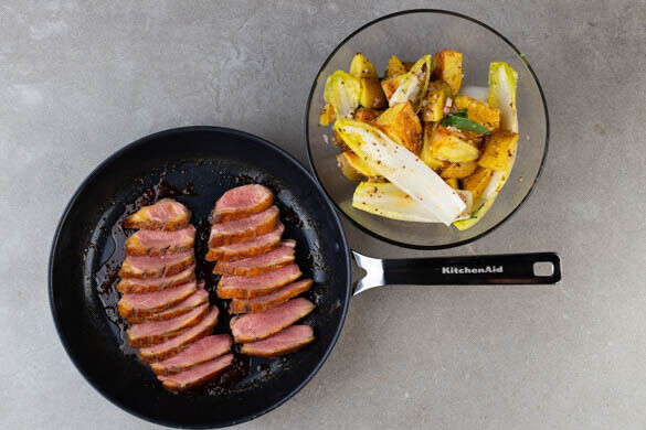 Zarte Entenbrust à l’orange an Kartoffel-Chicorée-Salat mit Nüssen