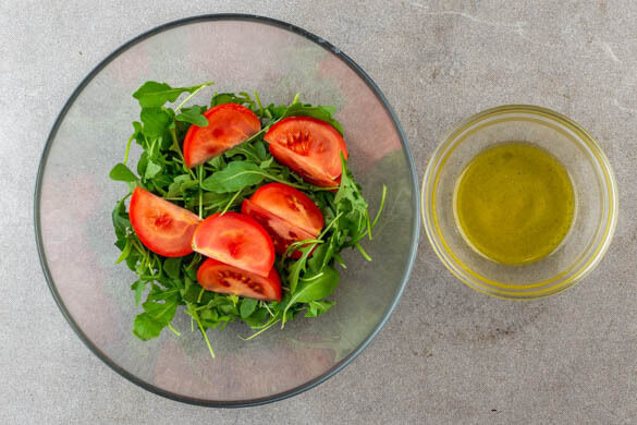 Die Tomate in dünne Spalten schneiden und mit dem Rucola vermengen. Aus 2EL Olivenöl, 1EL Essig sowie je 1 Prise Salz, Pfeffer und Zucker ein Dressing anrühren. Beides bis zum Servieren beiseitestellen.