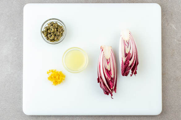 Inzwischen den Backofen auf 60°C vorheizen. Den Chicorée längs halbieren. Die Zitronenschale abreiben, dann die Zitrone halbieren und auspressen. Die Kapern grob hacken. Die ½ des Brühgewürzes in 400ml heißem Wasser auflösen. Die Aubergine ohne Deckel weitergaren, bis das Wasser verdampft ist und die Aubergine braun wird, dann auf niedrigster Stufe warm halten.