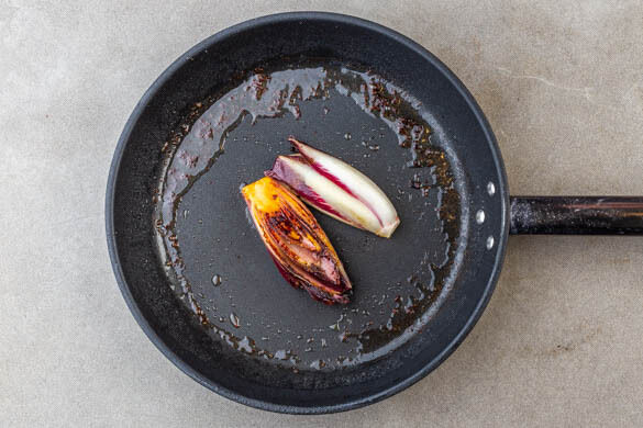 Das Fleisch aus der Pfanne nehmen und auf einem mit Backpapier ausgelegten Backblech im Ofen warm halten. Die Schnittflächen des Chicorées mit je 1 Prise Salz und Zucker an einreiben, dann den Chicorée mit den Schnittflächen nach unten in die Pfanne geben und bei mittlerer Hitze 3–5Min. braten, bis die Schnittflächen goldbraun und karamellisiert sind.