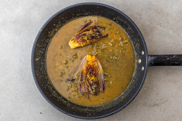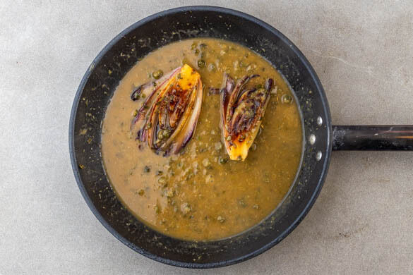 1EL Butter und die Kapern zum Chicorée in die Pfanne geben und 30–60Sek. mitbraten. Den Chicorée vorsichtig wenden, ½EL Mehl hinzugeben und unter ständigem Rühren 30–60Sek. mitbraten. Die ½ der Brühe langsam einrühren und zum Kochen bringen, dann bei niedrigster Hitze 2–3Min. köcheln lassen, bis eine sämige Sauce entsteht.