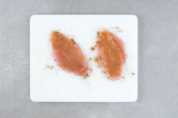 Das Fleisch mit etwas Küchenkrepp trocken tupfen und in der Mitte halbieren, sodass insgesamt 4 dünne Schnitzel entstehen. Diese mit der 1/2 der Gewürzmischung einreiben.
