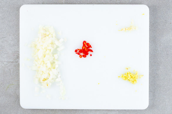 Den Knoblauch und den Ingwer schälen und fein reiben. Die Chilischote längs halbieren und in hauchdünne Streifen schneiden. Tipp: Für weniger Schärfe die Kerne entfernen. Die Zwiebeln schälen, halbieren und in feine Würfel schneiden.