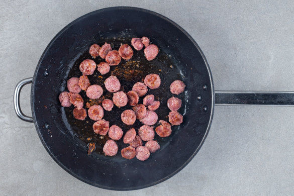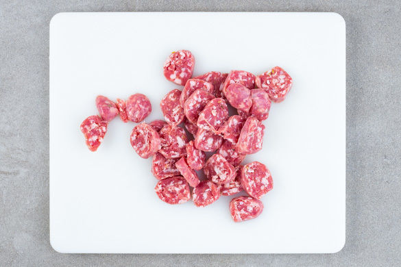 Die Salsiccia von der Pelle befreien und in ca 0,5cm dünne Scheiben schneiden.