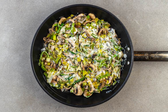Die Crème fraîche in die Pfanne geben und mit den Pilzen und dem Lauch verrühren.