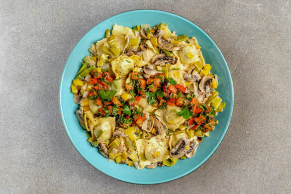 Heute gibt es leckere Pasta für Groß und Klein – und das auch noch in Windeseile. Herrliche Ricotta-Spinat-Tortelli werden in einer köstlichen Sauce aus Crème fraîche, feinen Champignons und frischem Lauch geköchelt. Obendrauf gibt es ein verfeinerndes Topping aus fruchtigen Tomaten, Schnittlauch und Petersilie. Wer kann da schon widerstehen? Guten Appetit!