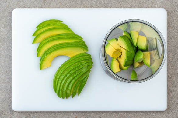 Die Avocado halbieren, den Kern entfernen und das Fruchtfleisch mit einem Esslöffel aus der Schale lösen. Eine Avocadohälfte in dünne Scheiben schneiden, die andere Hälfte in ein hohes Püriergefäß geben.