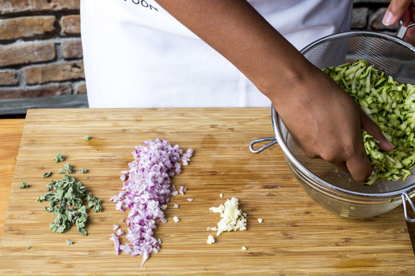 Die Zucchini mit der groben Seite einer Küchenreibe raspeln, mit 1 Prise Salz mischen und ca. 5Min. ziehen lassen. Anschließend die überschüssige Flüssigkeit durch ein Sieb auswringen. Die Zwiebel und den Knoblauch schälen und fein würfeln. Die Oreganoblätter von den Stängeln zupfen.