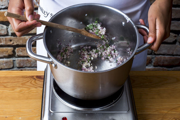 Die Zwiebeln, den Knoblauch und den Oregano in einem großen Topf mit 1–2EL Olivenöl bei mittlerer Hitze ca. 1Min. anschwitzen.