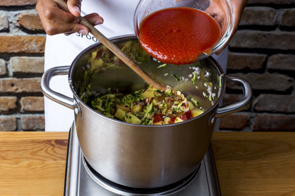 Die 1/2 des Brühgewürzes in 100ml heißem Wasser auflösen. Die Kartoffeln und die Zucchini zu den Zwiebeln geben und mit der Brühe und den passierten Tomaten ablöschen. Das Gemüse 10–12Min. bei mittlerer Hitze köcheln lassen.