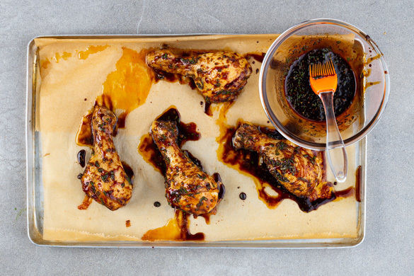 Ca. 5Min. vor Ende der Garzeit die Drumsticks mit der Glasur einpinseln und fertig garen. Die Gemüsepommes mit Salz und Pfeffer würzen und mit den Drumsticks und dem Dip anrichten. Mit den Lauchzwiebeln garnieren und servieren. Tipp: Wer mag, kann noch die Bratensauce vom Backblech über die Drumsticks träufeln.