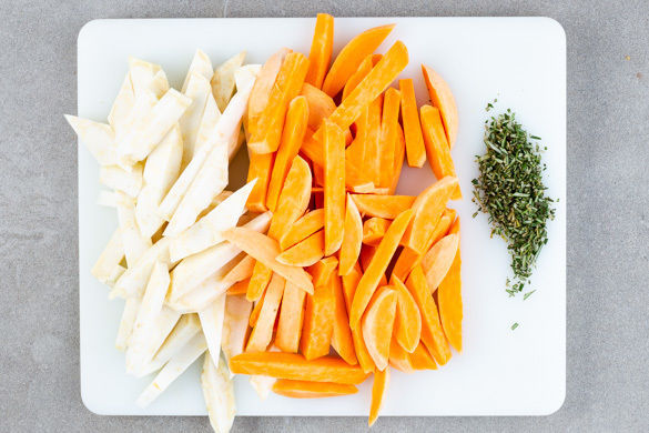 Die Süßkartoffeln und den Sellerie schälen, in ca. 1cm dünne Scheiben schneiden und anschließend in ca. 1cm breite, pommesartige Stifte schneiden. Die Rosmarinnadeln abzupfen und möglichst fein schneiden.