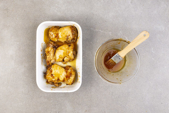 Die Aprikosenkonfitüre mit der Sojasauce verrühren und das Fleisch während der letzten 10Min. der Backzeit damit 2–3-mal einpinseln, sodass sich eine schöne Kruste bildet.