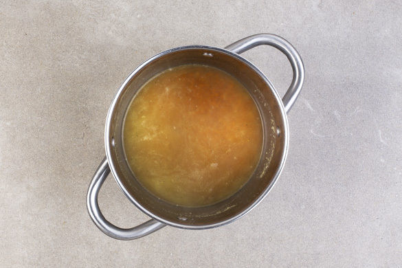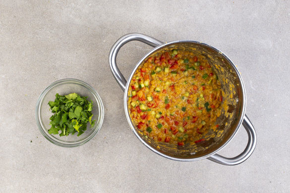Den Knoblauch in einem mittelgroßen Topf mit 1–2EL Olivenöl bei mittlerer Hitze ca. 1Min. anbraten, dann mit 400ml Wasser ablöschen. Das Brühgewürz dazugeben und einmal aufkochen lassen. Die Linsen unterrühren und 10–15Min. köcheln lassen, bis sie gar sind.