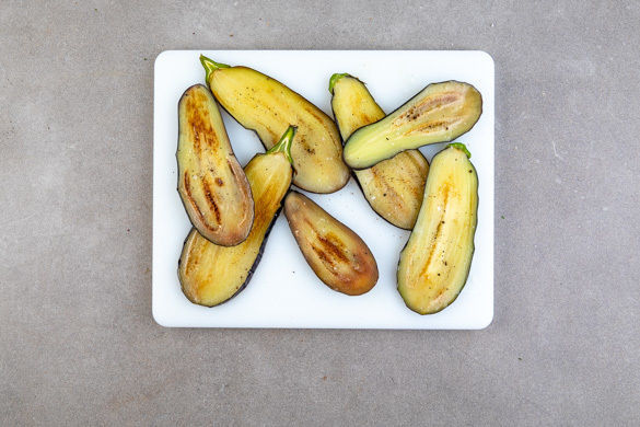 Die Aubergine längs in ca. 0,5cm dünne Scheiben schneiden. Die Auberginenscheiben in einer großen Pfanne mit 2–3EL Olivenöl bei mittlerer Hitze auf jeder Seite 1–2Min. goldbraun anbraten. Aus der Pfanne nehmen und mit Salz und Pfeffer würzen. Die Pfanne beiseitestellen.
