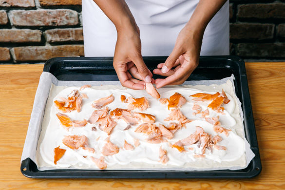 Die Teige mit dem Papier nach unten auf zwei Backblechen ausrollen, mit der Crème fraîche bestreichen und den Lachs gleichmäßig darauf verteilen. Die Flammkuchen im Ofen 15–20Min. backen, bis sie knusprig sind.