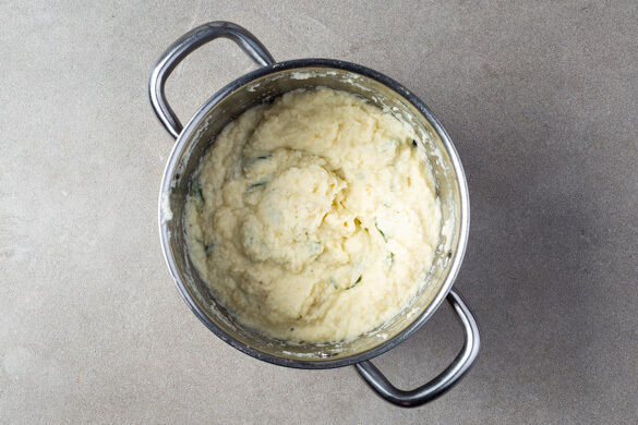 Den Blumenkohl in ein Sieb abgießen, dabei ca. 1 Tasse Kochwasser auffangen. Den Blumenkohl zurück in den Topf geben, den Knoblauch aus der Haut drücken und dazugeben. Alles mit einem Stabmixer fein pürieren, dabei ggf. löffelweise Kochwasser zugeben. Den Käse fein reiben und mit ⅔ des Basilikums unter das Püree mengen. Mit Salz und Pfeffer abschmecken.