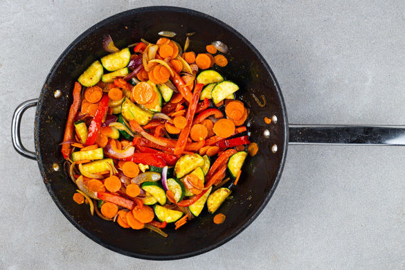 Die Zucchini längs halbieren und quer in breite Scheiben schneiden. Die Paprika vierteln, entkernen und in dünne Streifen schneiden. Die Zwiebel schälen, halbieren und in feine Streifen schneiden. Die Karotte ggf. schälen und in dünne Scheiben schneiden.