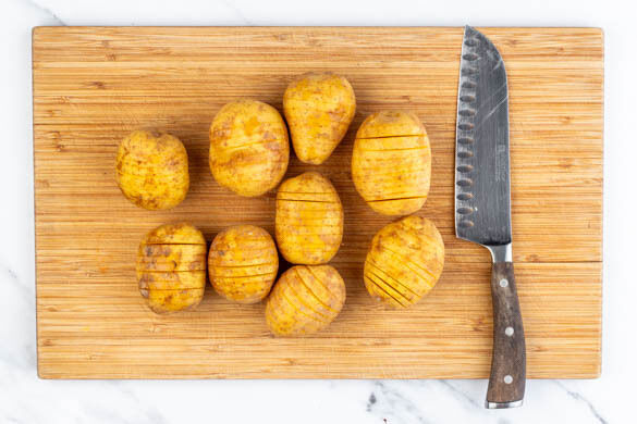 Den Backofen auf 220°C (200°C Umluft) vorheizen. Die Kartoffeln mit einem scharfen Messer mit Wellenschliff im Abstand von ca. 0,25cm einschneiden, aber nicht ganz durchschneiden.
