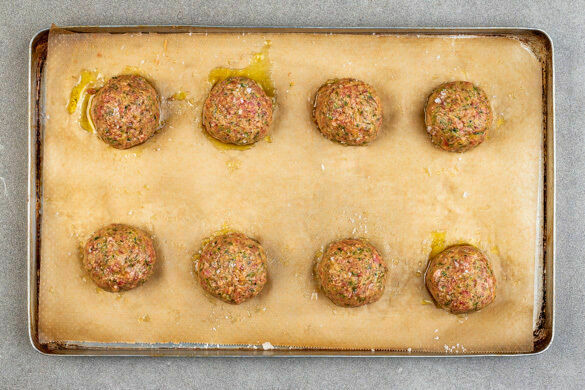 Das Hackfleisch mit den Händen gut durchkneten und zu 16 golfballgroßen Bällchen formen. Die Hackbällchen auf einem mit Backpapier ausgelegten Backblech verteilen, mit 2EL Olivenöl beträufeln und 20–25Min. im Ofen backen.