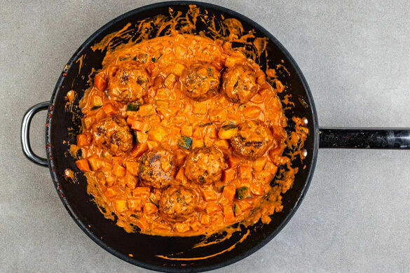 Das Tomatenmark zum Gemüse in die Pfanne geben und 1–2Min. mitgaren. Dann die Gewürzmischung, das restliche Brühgewürz, die Sahne und das Pastawasser einrühren und die Sauce bei niedriger Hitze 3–4Min. einköcheln lassen.