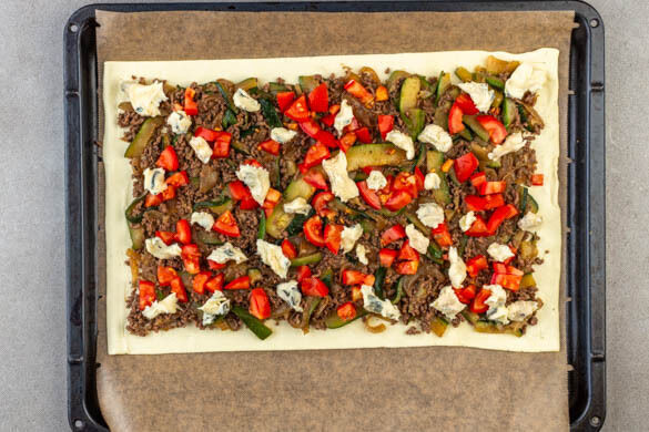 Die Teige mit dem Papier nach unten auf zwei Backblechen ausrollen. Die Fleisch-Gemüse-Mischung gleichmäßig auf den Teigen verteilen, dabei ca. 2cm Rand frei lassen. Die Teige mit den Tomaten belegen, dann den Blauschimmelkäse darüber zerkrümeln.