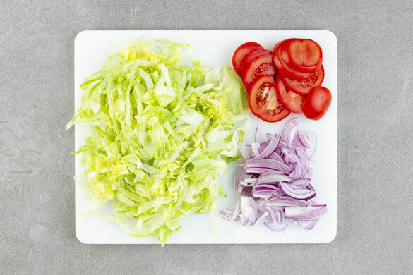 Den Salat in dünne Streifen schneiden, dabei den Strunk entfernen. Die Tomaten in dünne Scheiben schneiden. Die Zwiebeln schälen, halbieren und in dünne Streifen schneiden.
