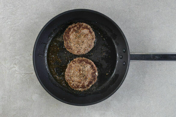 Die Pattys in einer großen Pfanne mit 1EL Olivenöl bei mittlerer Hitze abgedeckt auf jeder Seite 5–6Min. goldbraun braten. Die Burgerbrötchen im Ofen 3–5Min. aufbacken.