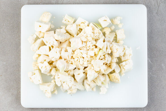 Den Blumenkohl in ca. 2cm große Stücke schneiden.