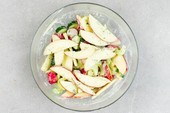 Den Sellerie in dünne Scheiben schneiden. Die Gurke längs halbieren, die Äpfel vierteln und entkernen und beides ebenfalls in dünne Scheiben schneiden. Die Radieschen vierteln und mit dem Sellerie, der Gurke und den Äpfeln vermengen.