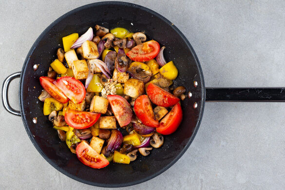 Das heutige Gericht ist mal wieder ein gutes Beispiel dafür, dass die vegane Küche zu Recht immer beliebter wird: Deine Geschmacksknospen werden von einer lecker gewürzten Gemüsepfanne mit Paprika, Champignons und Tomaten verwöhnt, die mit knusprigen Tofuwürfeln angereichert wird. Serviert wird der Festschmaus auf Naturreis, dazu gibt es eine aromatische Sauce mit Koriander und Peperoni. Lecker!