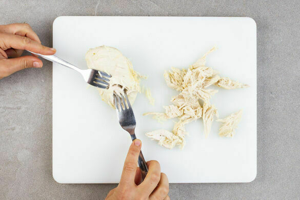 In einem weiteren mittelgroßen Topf ausreichend gesalzenes Wasser für die Nudeln aufkochen. Das Fleisch trocken tupfen, halbieren und in dem Topf mit der Brühe in 8–10Min. gar kochen. Das Fleisch anschließend aus der Brühe nehmen, abkühlen lassen und mit den Händen oder einer Gabel in feine Streifen zupfen.