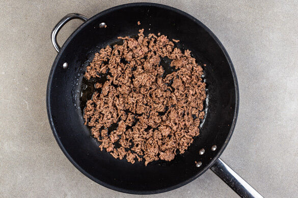 Das Hackfleisch in einer mittelgroßen Pfanne mit 1EL Olivenöl bei mittlerer Hitze in 3–4Min. krümelig anbraten.