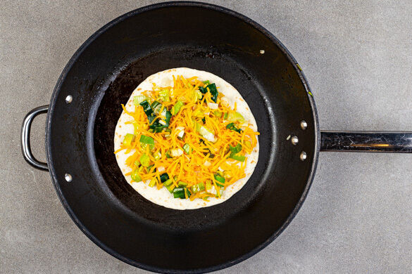 Die Pfanne auswischen, mit 1TL Olivenöl auspinseln und bei mittlerer Hitze erwärmen. 1 Tortilla in die Pfanne geben, mit der ½ des Lauchs belegen und mit 1 Tortilla bedecken. Tipp: Wer mag, kann die zweite Quesadilla parallel in einer weiteren Pfanne zubereiten.