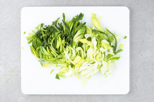 In einem mittelgroßen Topf 600ml leicht gesalzenes Wasser zum Kochen bringen. Den Lauch längs halbieren und in dünne Streifen schneiden.