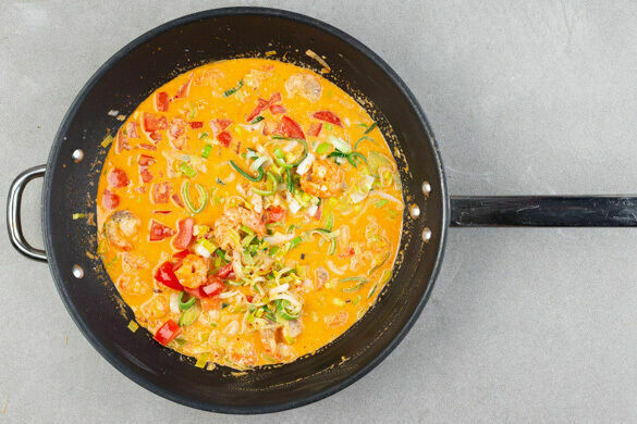 Zeit für ein cremiges Curry! Zarter Lauch, fruchtige Tomaten, zitronig-würziger Ingwer und aromatisches Thai-Basilikum machen aus diesem asiatischen Gericht eine echte Gaumenfreude. Feine Garnelen liefern eine Extraportion Eiweiß und die gelbe Currypaste heizt uns ordentlich ein. Und dann ist es auch noch ruckzuck fertig! Was will man mehr?