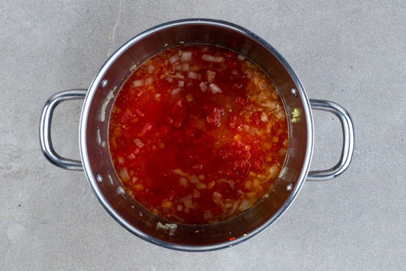 Die Zwiebeln in einem mittelgroßen Topf mit 1EL Pflanzenöl bei mittlerer Hitze ca. 2Min. anbraten. Die Knoblauch-Ingwer-Paste und die ½ der Peperonistreifen unterrühren und mit den gehackten Tomaten und 250ml Wasser ablöschen. Die Flüssigkeit aufkochen lassen.