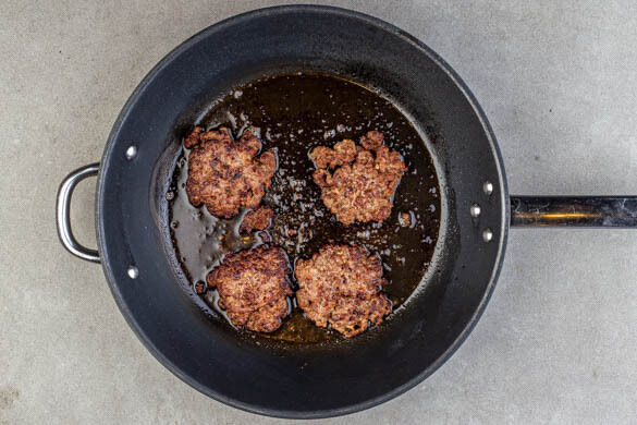 Das Hackfleisch mit je ½TL Salz und Pfeffer würzen und zu 4 gleich großen Kugeln formen. In einer großen Pfanne 1EL Olivenöl stark erhitzen. Die Kugeln in das heiße Öl geben und sofort mit einem breiten Pfannenwender flach drücken, die entstehenden Pattys sollten max. 1cm dick sein. Die Pattys 2–3Min. braten.
