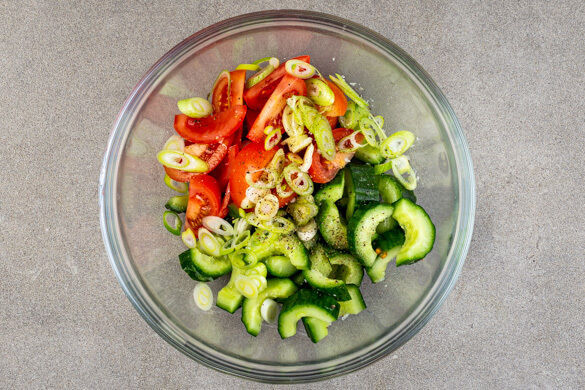Aus 2EL Olivenöl, 2EL Essig und je 1 kräftigen Prise Salz und Pfeffer ein Dressing anrühren und mit den Gurken, den Tomaten und den Lauchzwiebeln vermengen.