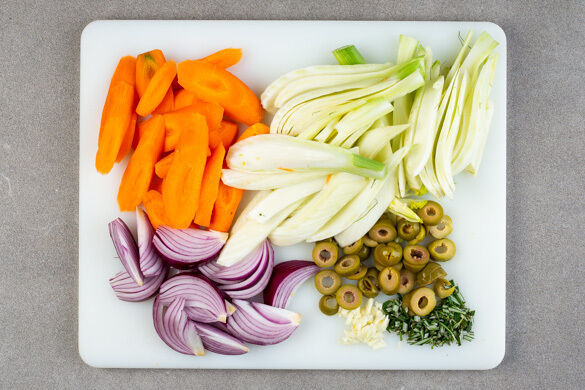 Den Backofen auf 240°C (220°C Umluft) vorheizen. Die Karotte ggf. schälen und schräg in ca. 2cm dicke Scheiben schneiden. Den Fenchel halbieren und in ca. 2cm dicke Scheiben schneiden, den Strunk entfernen. Die Zwiebel schälen, halbieren und in Spalten schneiden. Den Knoblauch schälen und grob würfeln. Die Oliven grob schneiden. Den Rosmarin abzupfen und grob schneiden.