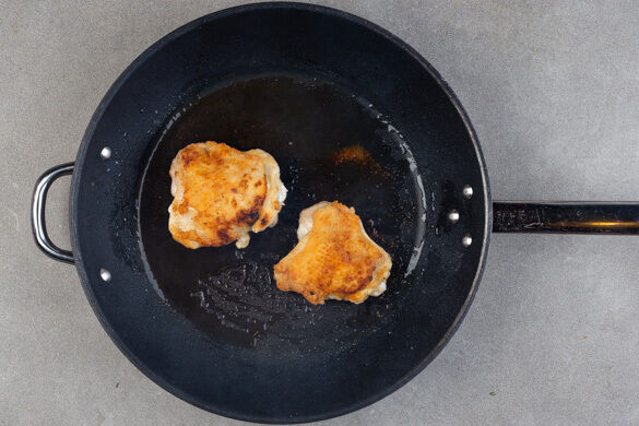 Das Fleisch trocken tupfen, mit je ½TL Salz und Pfeffer sowie 1EL Mehl einreiben. In einer großen Pfanne 1EL Pflanzenöl bei starker Hitze erwärmen. Das Fleisch hineingeben, sobald das Öl sehr heiß ist und auf jeder Seite 1–2Min. goldbraun anbraten.