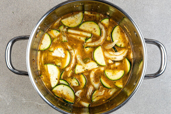 In einem Wasserkocher 600ml Wasser zum Kochen bringen. Die Zucchini längs halbieren und in ca. 0,5cm dicke Scheiben schneiden. Den Fenchel längs halbieren und in dünne Streifen schneiden, dabei den Strunk entfernen. Das Fenchelgrün für die Garnitur beiseitelegen. Den Knoblauch schälen und grob würfeln. Die Oliven grob würfeln.