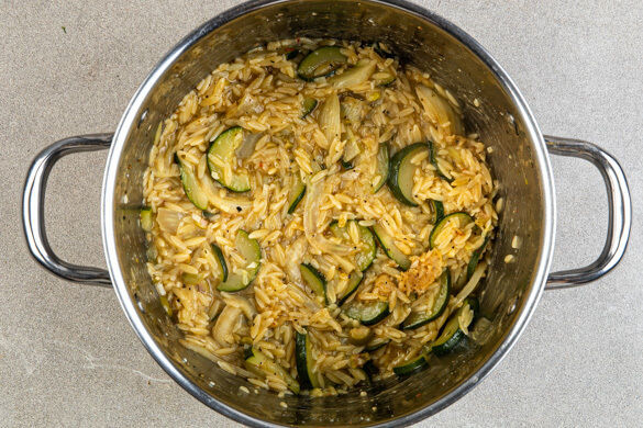 Die Zucchini und den Fenchel in einem mittelgroßen Topf mit 1EL Olivenöl und der Gewürzmischung bei mittlerer Hitze 4–6Min. anbraten, dann den Knoblauch und die Oliven zugeben und ca. 30Sek. mitbraten. Das Brühgewürz und das kochende Wasser einrühren.