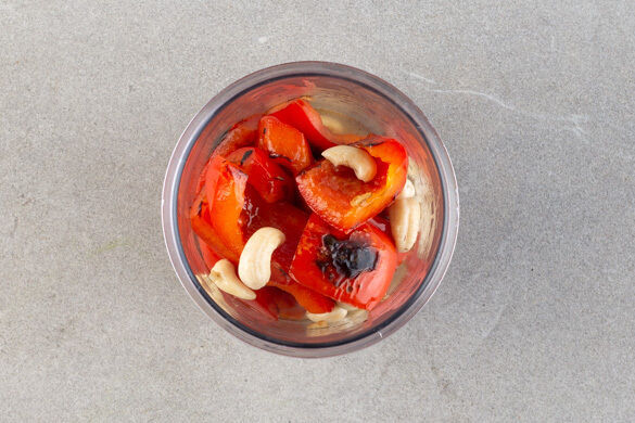 In einem großen Topf ausreichend gesalzenes Wasser für die Pasta zum Kochen bringen. In einem Wasserkocher 250ml Wasser aufkochen (je nach Mindestmenge ggf. mehr Wasser aufkochen). Die Cashews in einem hohen Püriergefäß mit 250ml kochendem Wasser übergießen. Die Paprika vierteln, entkernen und in grobe Stücke schneiden. Den Knoblauch schälen und grob würfeln.