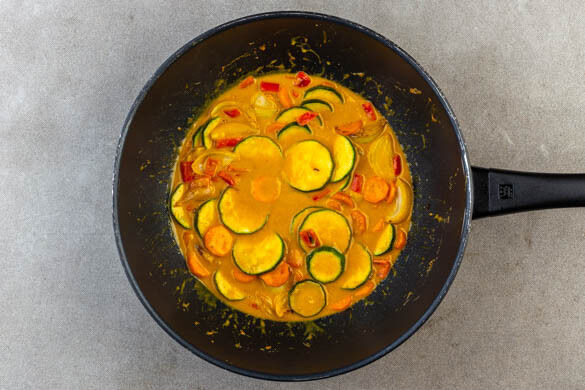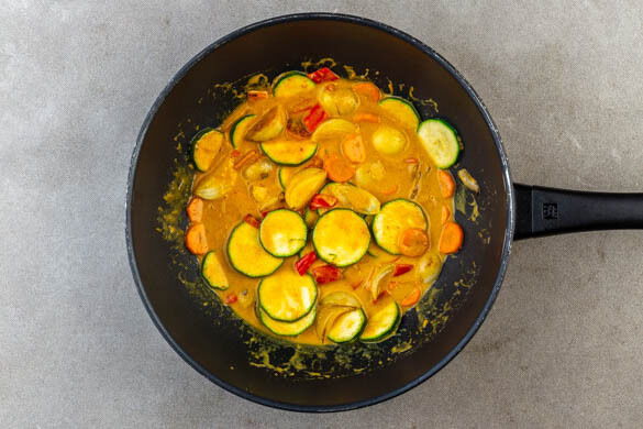 Die Zwiebeln in einem Wok oder einer großen Pfanne mit 1EL Pflanzenöl bei starker Hitze ca. 2Min. anbraten, dann den Gemüsemix hinzugeben und ca. 1Min. mitbraten. Die Currypaste einrühren und 2–3Min. braten, bis es duftet und die Paste leicht eingekocht ist. Die Kokosmilch einrühren und zum Köcheln bringen.