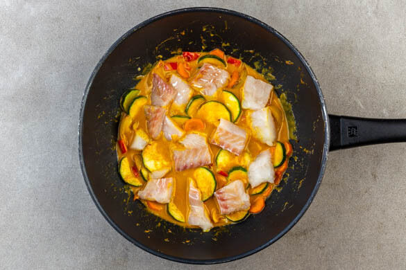 Den Fisch trocken tupfen und in das Curry geben. Das Curry einmal aufkochen lassen, dann vom Herd nehmen und den Fisch im heißen Curry abgedeckt ca. 5Min. pochieren, bis der Fisch gar ist.