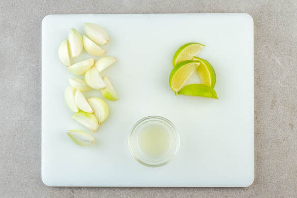 Währenddessen die Zwiebeln schälen, halbieren und in Spalten schneiden. Die Limette halbieren und eine Hälfte auspressen, die andere Hälfte in Spalten schneiden.
