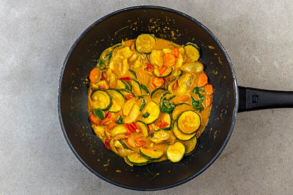 Die Zwiebeln in einem Wok oder einer großen Pfanne mit 2EL Pflanzenöl bei starker Hitze ca. 2Min. anbraten, dann den Gemüsemix hinzugeben und ca. 1Min. mitbraten. Die Currypaste einrühren und 2–3Min. braten, bis es duftet und die Paste leicht eingekocht ist. Die Kokosmilch einrühren und zum Köcheln bringen.