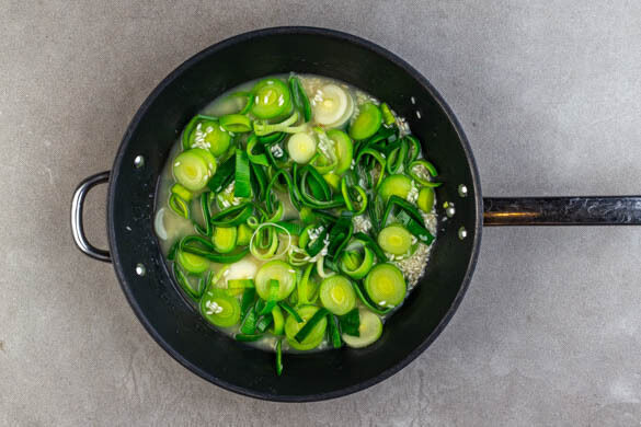 Das Brühgewürz in 1,5L heißem Wasser auflösen. Den Lauch und den Reis in einer großen Pfanne mit 2EL Olivenöl bei starker Hitze 1–2Min. anbraten, dabei regelmäßig umrühren.