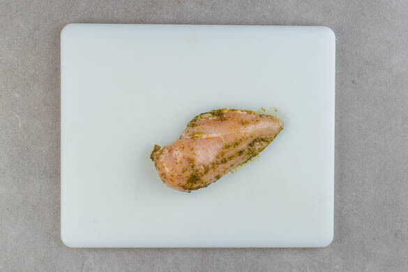 Die Basilikumcreme mit 1 Prise Salz verrühren. Das Fleisch trocken tupfen und gründlich mit der Basilikumcreme einreiben.